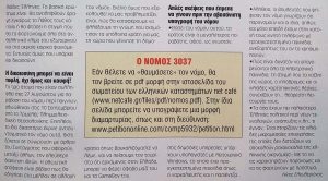 Από Βικιπαίδεια: Το 2002 η ελληνική κυβέρνηση, φαινομενικά, σε μια προσπάθεια για την καταπολέμηση των παράνομων τυχερών παιχνιδιών, πέρασε τον ασαφή και αμφιλεγόμενο νόμο 3037/2002 που απαγόρευε ουσιαστικά όλα τα ηλεκτρονικά παιχνίδια σε δημόσιους χώρους. Κατά τη διάρκεια μιας υπόθεσης κατά ορισμένων ιδιοκτητών ίντερνετ καφέ που επέτρεψαν στους πελάτες τους να παίξουν online σκάκι και άλλα παιχνίδια, ένα τοπικό δικαστήριο στην Θεσσαλονίκη κήρυξε τον νόμο αντισυνταγματικό.Περισσότεροι από 300 άνθρωποι συγκεντρώθηκαν έξω από το δικαστήριο για να υποστηρίξουν τους ιδιοκτήτες των ίντερνετ καφέ. Η Ευρωπαϊκή Επιτροπή έστειλε επίσημη επιστολή προς το ελληνικό Υπουργείο Εξωτερικών, εξηγώντας ότι ο νόμος μπορεί να έρχεται σε σύγκρουση με την ευρωπαϊκή νομοθεσία. Ο νόμος επηρέασε τόσο τους Έλληνες πολίτες όσο και τους ξένους.